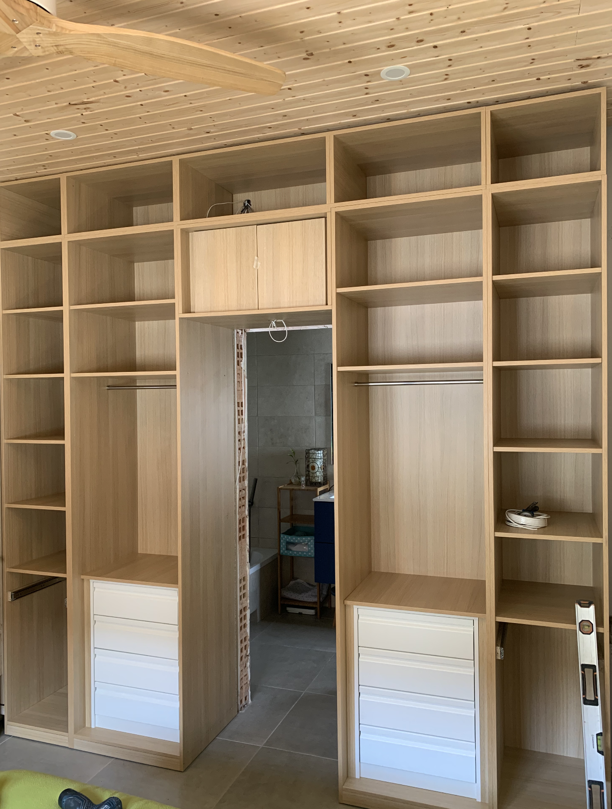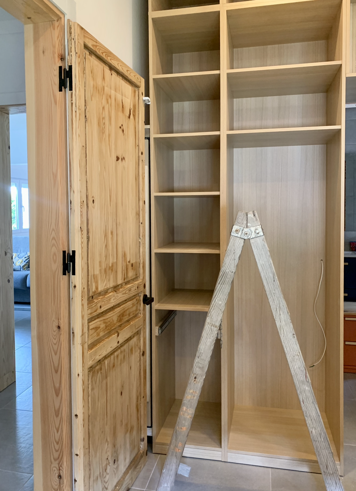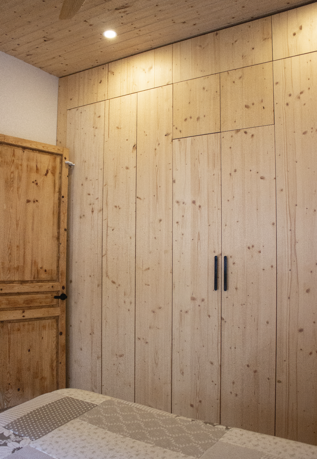 Armari a mida - ref. MMQue diries que hi ha dins d’aquest armari?Doncs a part de roba de tota mena, hi ha fins i tot un bany! Hem fet un armari a mida, que aprofiti cada centímetre disponible, per poder organitzar la roba i tot allò que vulguis.Aquest armari està construït amb fusta de tricapa d’avet, per la seva resistència i elegància. El resultat és un armari amb molt d’espai útil, amb calaixeres interiors, pantaloners i barres per a penjar jaquetes i vestits llargs.Un moble elegant i càlid, que fan de l’estança un espai més acollidor.